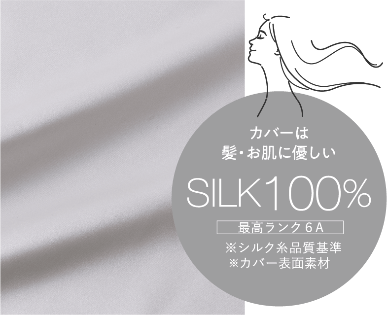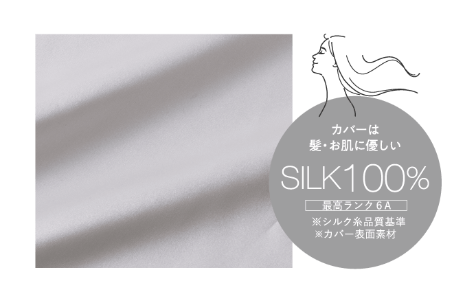 カバー表面素材には上質なシルク100%(最高ランク6A)を使用し、髪や肌にも優しい仕上がりになっています。